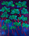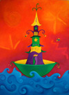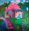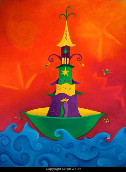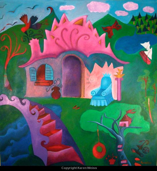 Karen's paintings primarily use imaginary landscape and playful architectural forms to comment on both personal and global issues. Color is a deep, resonant language to her and is significant in the creation of the work. Her lyrical and vivid paintings can evoke a range of emotions, from reverent to humorous and ironic, reflecting the dichotomies in life and perseverance of the human spirit.